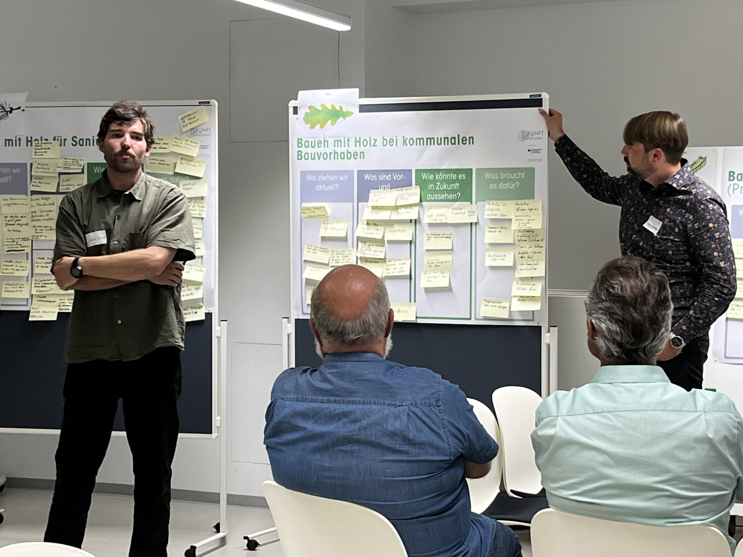 Über die Notwendigkeit eines Unternehmensnetzwerks Holzbau wurde ebenso intensiv diskutiert. In den Ergebnissen finden sich Gedanken von der direkten Kooperation mit Brettsperrholzherstellern, über die Suche nach ganzheitlich arbeitenden Handwerkern oder eine Handwerkerkooperation mit Abdeckung aller Gewerke. Hierauf folgend ist eine Aufklärungskampagne angedacht worden, die sowohl zu mehr Mut bei den Planern führen könnte als auch Vertrauen in den Baustoff Holz aufbauen würde.